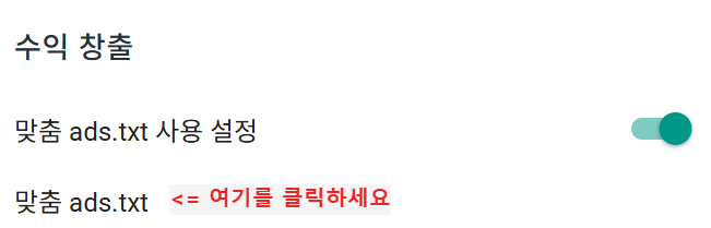 - "맞춤 ads.txt 사용 설정" 토글을 켬.